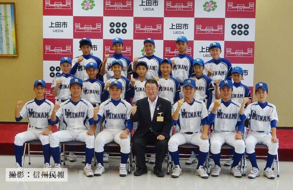 3つの全国大会に出場する、上田市の少年硬式野球チーム「上田南リーグ」は18日、市庁舎に土屋陽一市長を表敬訪問し、大会への抱負を語った。同チームは「シニア」(中2、3年)、「リトル」(小6、中1年)」「マイナー」(小4、年)、「ファーム」(小3年以下)」の4クラスを持ち、上田市小泉の日置電機㈱グラウンドをホームとし、活動する。