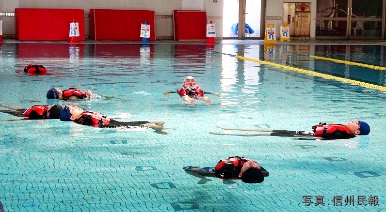 また後半は健康運動指導士の資格を持つ、みまき福祉会・笹本和宏さんが講師となりプールで実技研修。「海、川、池、湖そしてプール、風呂でも水難事故が起こる」とし、浮くこと、呼吸方法、ライフジャケット装着法などの体験を指導した。