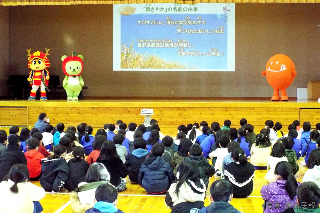 風さやかは県農業試験場が13年の歳月をかけて開発し、平成25年に品種登録。同校講堂で行われた出前授業では県の上田農業農村支援センター・上原誉之さんがクイズを交えながら「米が収穫されるまで」「上田で美味しい米がとれる理由」「風さやかの魅力」を楽しく伝える。県のマスコットキャラクター「アルクマ」、県地産地消推進キャラクター「旬ちゃん」、JA信州うえだキャラクター「真田のぼるくん」も参加。子どもらは元気よく手を上げ、「風さやか開発のきっかけは?」など質問や感想を述べた。