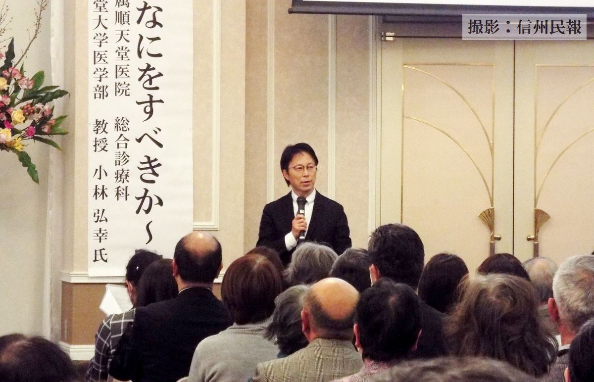 講師はテレビなどにも数多く出演し、著書も多数ある順天堂大学医学部の小林弘幸教授。自律神経研究の第一人者である小林教授は、「健康の正体~今なにをすべきか~」をテーマに講演。「ミスには原因がある」として自律神経の乱れを挙げ、自律神経を司る交感神経と副交感神経のバランスなどについて説く。