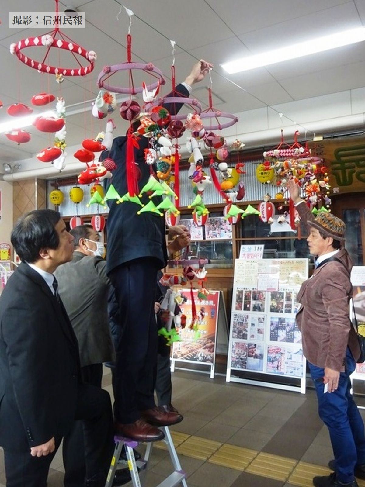 別所温泉つるし飾りの会・滝沢代表らは、「復興のお手伝いができるならと思い、これまで作り溜めてきたものから駅に合うものを選んで持ってきた」と話し、ロータリークラブ員は心を込めて製作した作品に感心し、「風情があり、癒し効果がある」と協力への感謝を口にした。