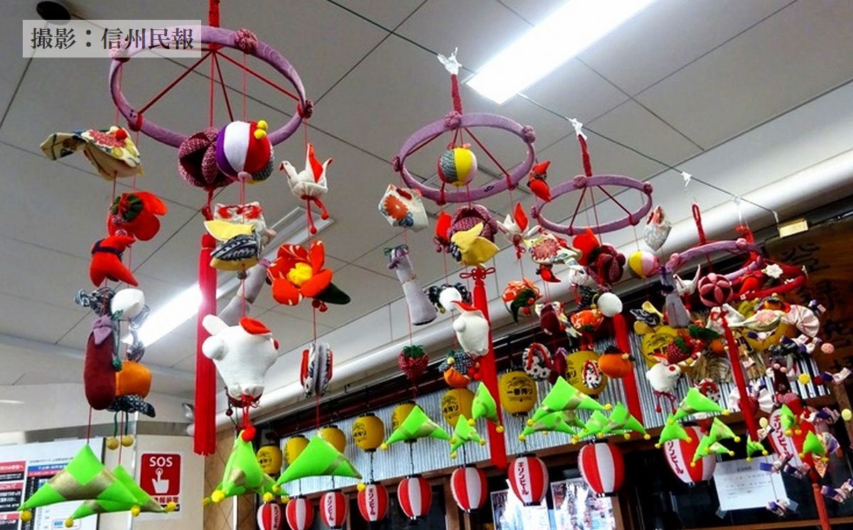 今回は「桃の節句」に合わせ、別所温泉つるし飾りの会(滝沢まつえ代表、21人)の協力を得て「つるし飾り」を設置。この日は約10人の会員が作業に参加し、切符売り場前は10飾りで華やかに彩り、また待合室内にも3飾りをつるした。